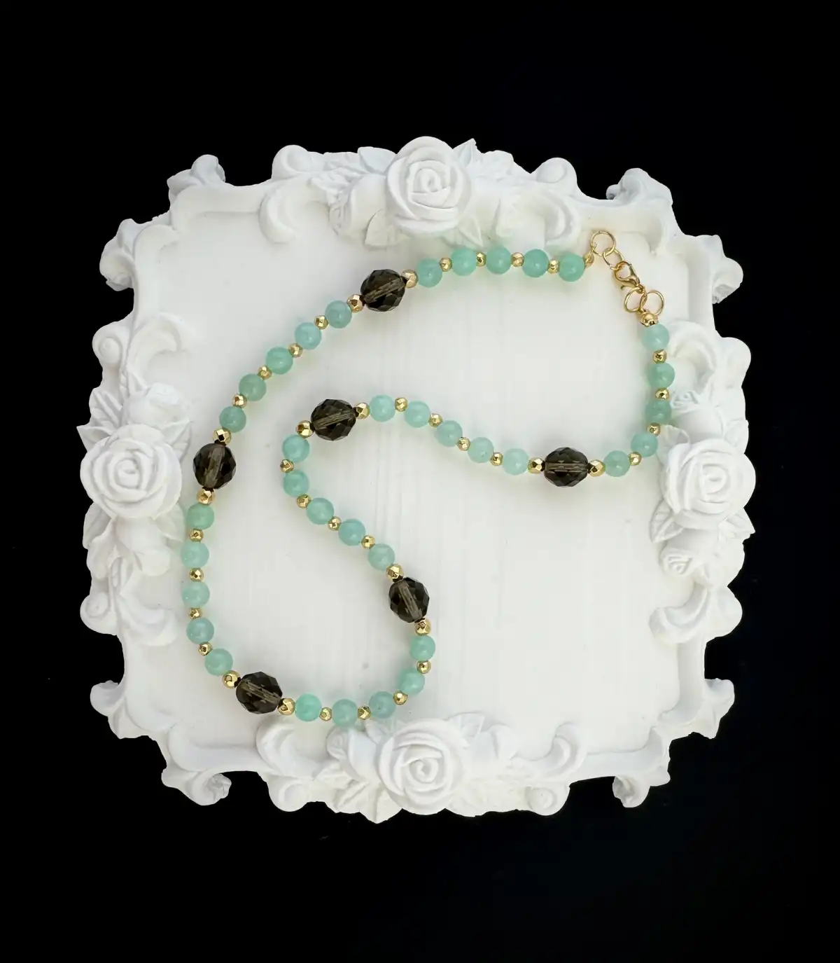 - амазонит - хематит цвят златен, фасетиран - австрийски кристал - дължина 44 см без удължител, с възможност за добавяне